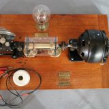 Est-ce l´élément d´un autre appareil? Il y a 3 plaquettes en laiton gravées. Pour la première, Lampe de 25 bougies à 110 Volts. Filament de charbon. Pour la deuxième,